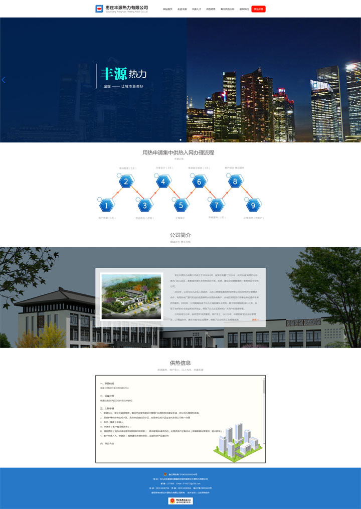 棗莊豐源熱力有限公司成立于2008年8月,座落在有著“江北水鄉,運河古城”美譽的山東南大門臺兒莊區,是集城市循環水供熱項目開發、投資、建設及經營管理的一家跨地區專業性公司。 2008年,公司與臺兒莊區人民政府、山東王晁煤電集團熱電有限公司采用特許經營模式合作,利用熱電廠凝汽機組的低溫循環水實現熱電聯產,向城區居民及行政事業單位提供冬季供熱服務。2008年,公司圓滿完成了臺兒莊城區循環水供熱一期工程的建設和運行任務,實現了良好的社會效益和經濟效益,得到了臺兒莊區政府和廣大用戶的高度贊譽。