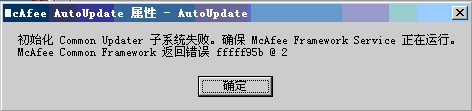 作為一名忠實的麥粉,多年來我一直使用McAfee這款殺毒軟件。但近一周開始McAfee出現(xiàn)無法更新的狀況,自動更新和手動更新都失敗,彈出錯誤提示窗口的信息為“初始化Common Updater子系統(tǒng)失敗.確保McAfee Framework service正在運行.McAfee Framework service返回錯誤 ffffffdf @ 3”。