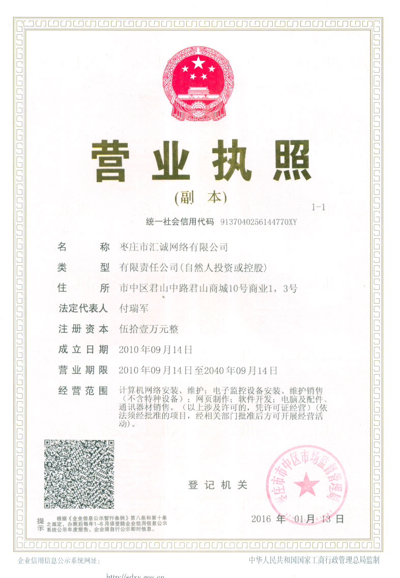 特提供三證合一后的新營業執照副本如下 棗莊市匯誠網絡有限公司營業執照(統一社會信用代碼:9137040256144770XY)